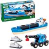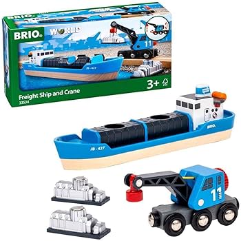 The popular container ship carries cargo across the imagined waters. Load and offload by using the moveable crane to crank up the magnetic loads from the ship and place them on any train wagon from BRIO. This item includes 1x Ship, 1x Crane, 2x Magnetic Loads and measures 23x 9 x 6.1cm
