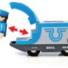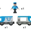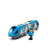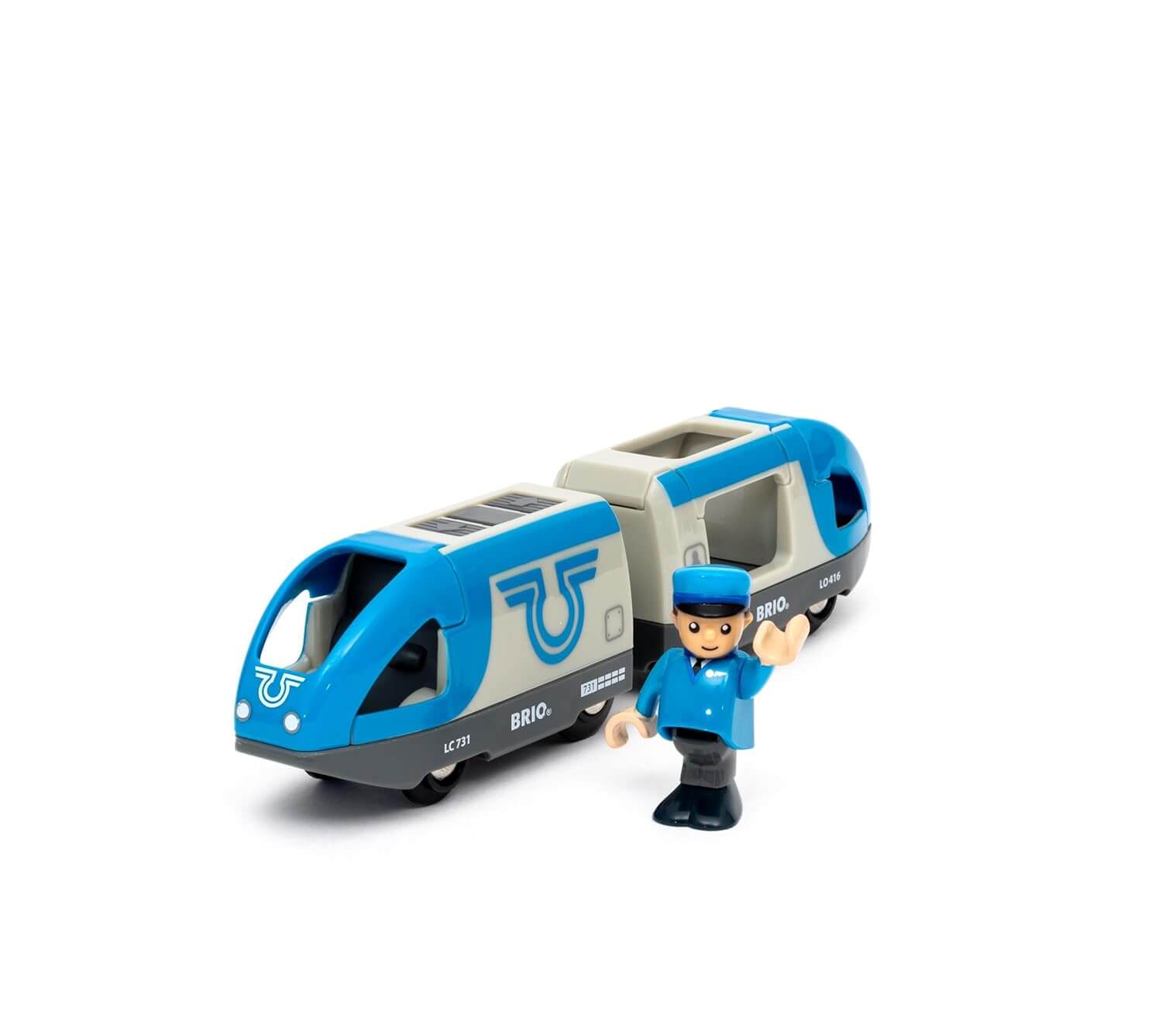 This modern battery train travels all over the BRIO World. The engine driver sits comfortably in his seat ready to take passengers out on new adventures. The battery powered train can move forwards and backwards with a press of the button on top of the cab.