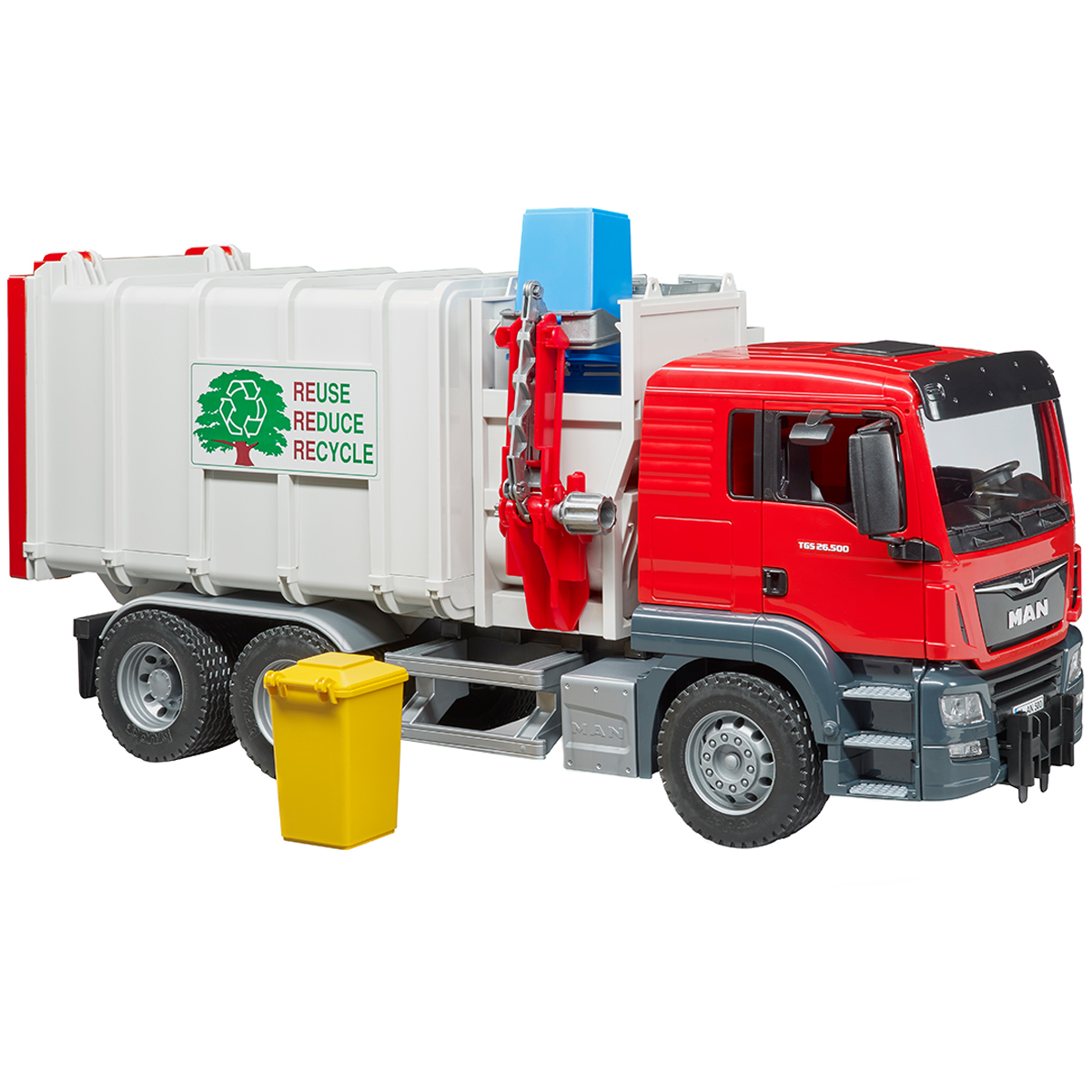 A cutting-edge side loader refuse collector. A lifter unit moves out at the side to grab bins and empty them without the need for a second person. Two screw-type compactors move the waste on the inside of the loading body towards the rear. After having opened the tailgate, the body tilts to empty out the vehicle. Thanks to this detailed toy children can realistically discover the exciting tasks involved in refuse collection and recycling – “just like the real thing”.