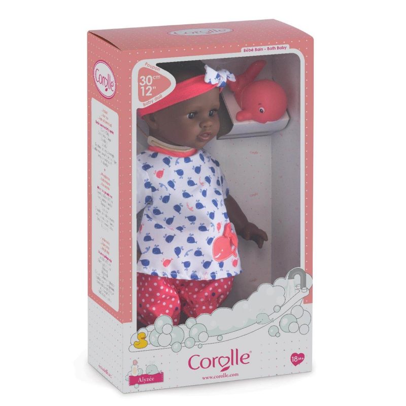 The Mon Premier Bébé Bath Girl is dressed in a top and leggings, is wearing a headband and comes with her rubber frog.