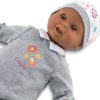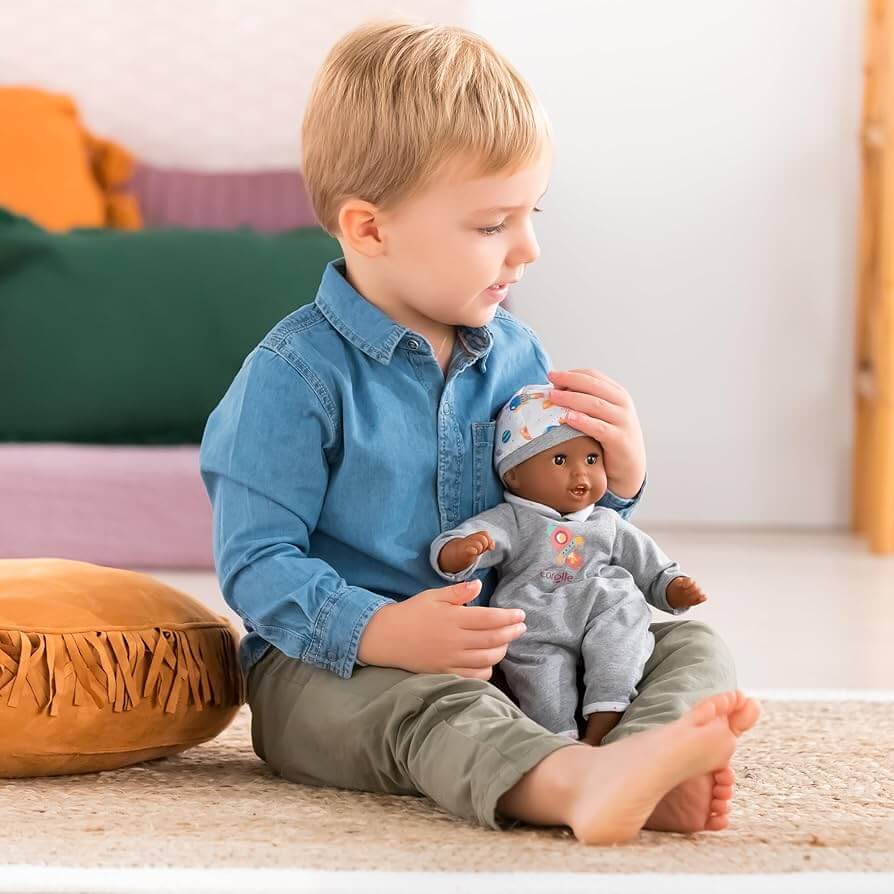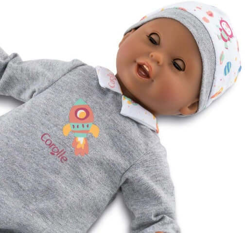 The doll’s head, arms and legs are made of soft-to-the-touch vinyl that is delicately scented with vanilla, a Corolle signature. Bébé Calin Marius is dressed in a grey onesie with matching stocking cap.