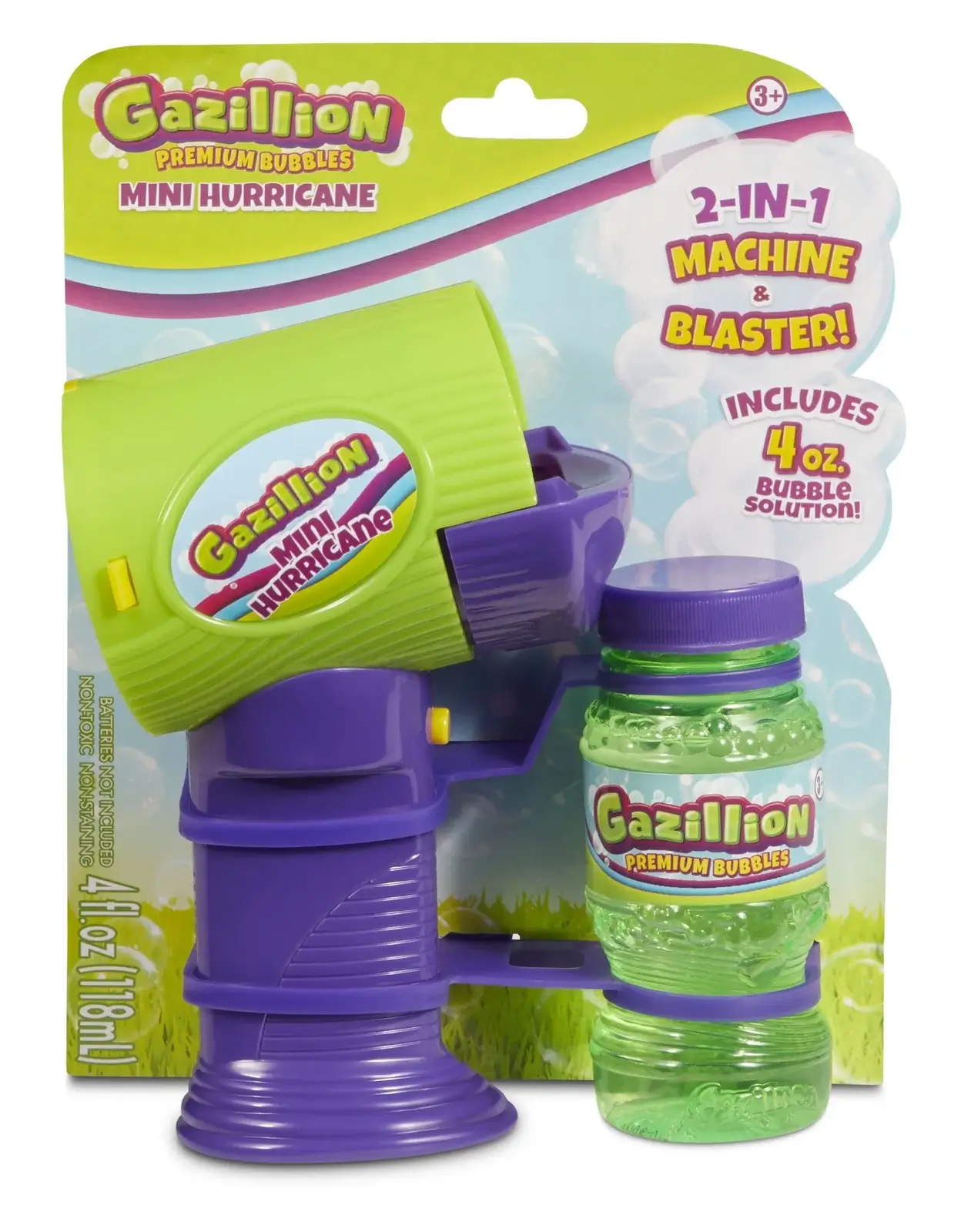 Includes a 4 oz. bottle of Gazillion Premium Bubbles solution. 3 AAA batteries required, not included.