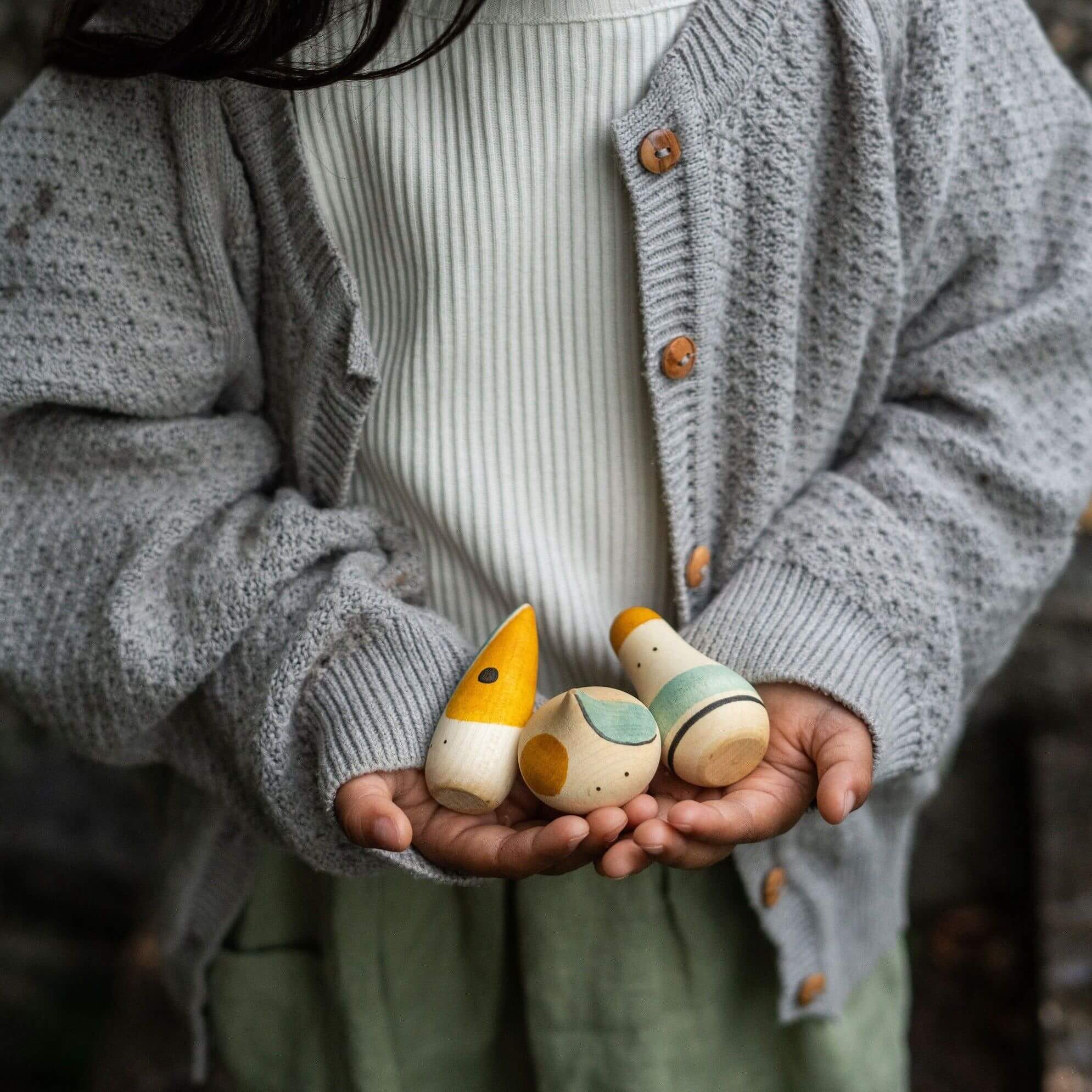 Grapat’s natural Hooray! are beautifully simple, three organic shaped wooden figures, reflecting the beauty of nature coloured in mustard/green tones. The perfect size for little hands to grasp and hold, they can be used in a variety of ways for discovery and imaginary play.