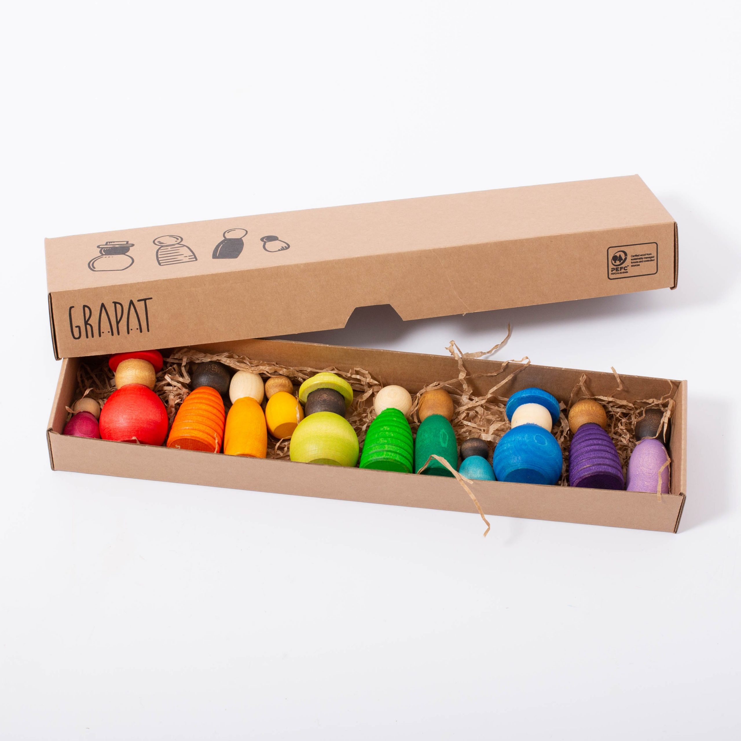 Featuring 12 Nins in 3 skin tones: 3 narrow Nins, 3 wide Nins, 3 striped Nins, 3 Baby Nins. Includes a fabric bag for travelling or storage.