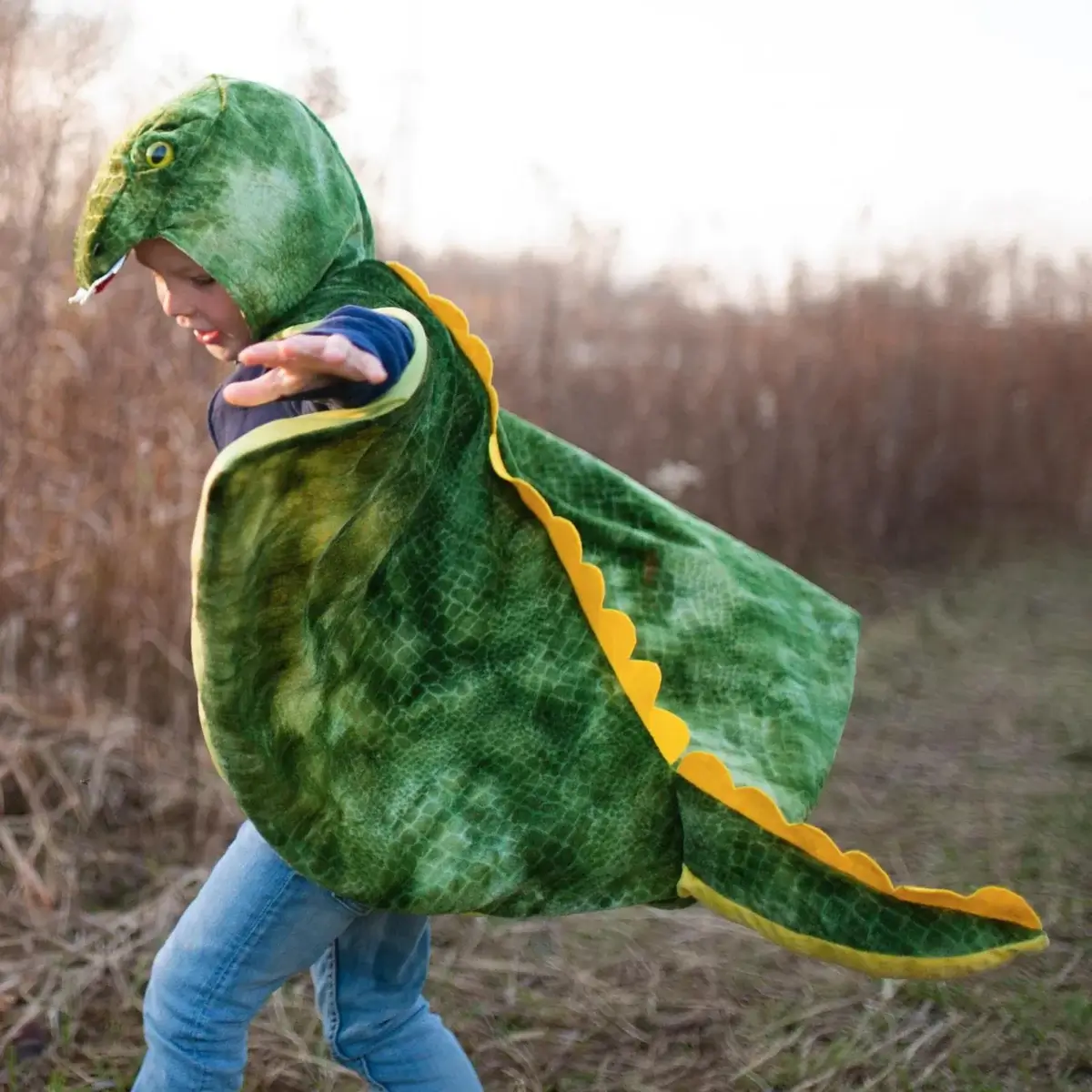 This dinosaur cape features textured velour fabric, realistic eyes, and 3D stuffed detailing on the hood. The design includes a long trailing tail and big felt teeth. A lined hood and Velcro closure makes this cape durable and ready for many wears.