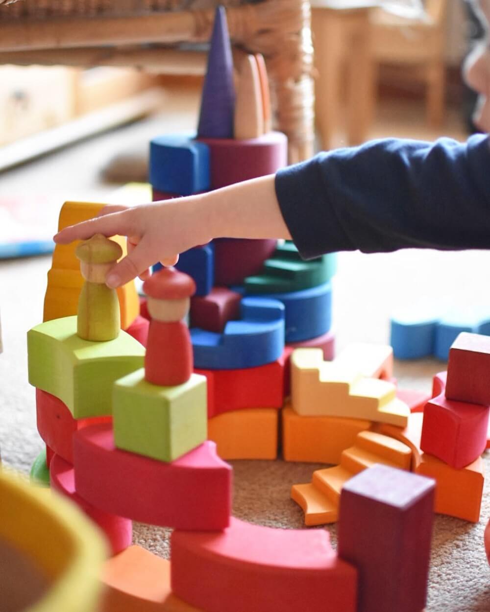 Made from sustainable lime wood, the blocks have been stained with water-based colour, allowing the natural grain of the wood to shine through and ensuring that they are safe for young children. As the blocks are not varnished, they will not slip easily when used to build imaginative constructions. Combine with other play blocks and toys to make steps that spiral around towers and cityscapes, or your own beautifully curved structures. Mix with Grimm’s building blocks – such as the Geo Blocks or 1001 Nights – for a fantasy rainbow-coloured, interconnected world that can be traversed at will.