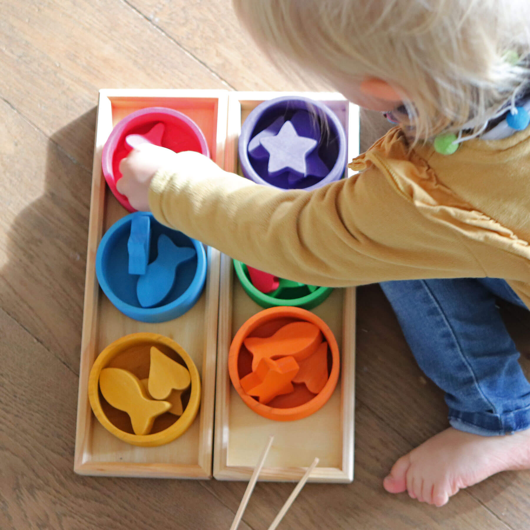 Using these bowls, small children can sort colours, put the figures in and count them. For older children, using the tweezer is a challenge; it is not easy to grab the fish and sort it into the intended bowl!