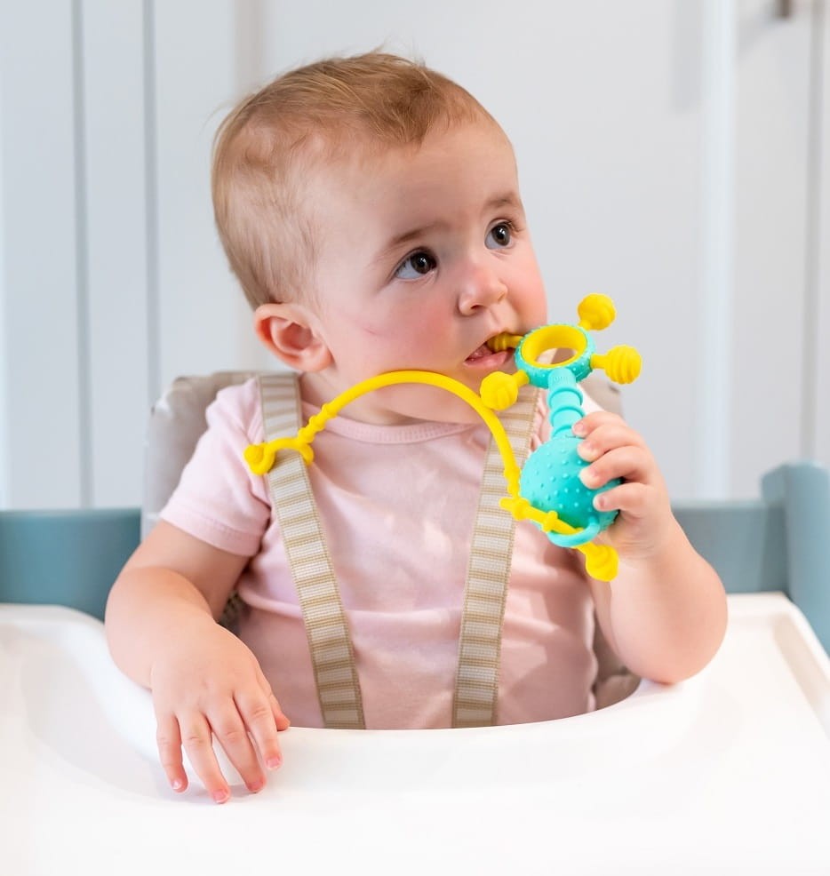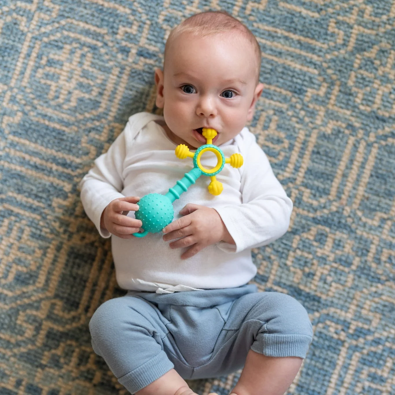 The perfect teether for your little one! Made out of 100% food grade silicone, it’s safe and non-toxic for your gumming child. With textured chewy nubs, easy to hold grip, and gentle rattle it will help children explore and grow.