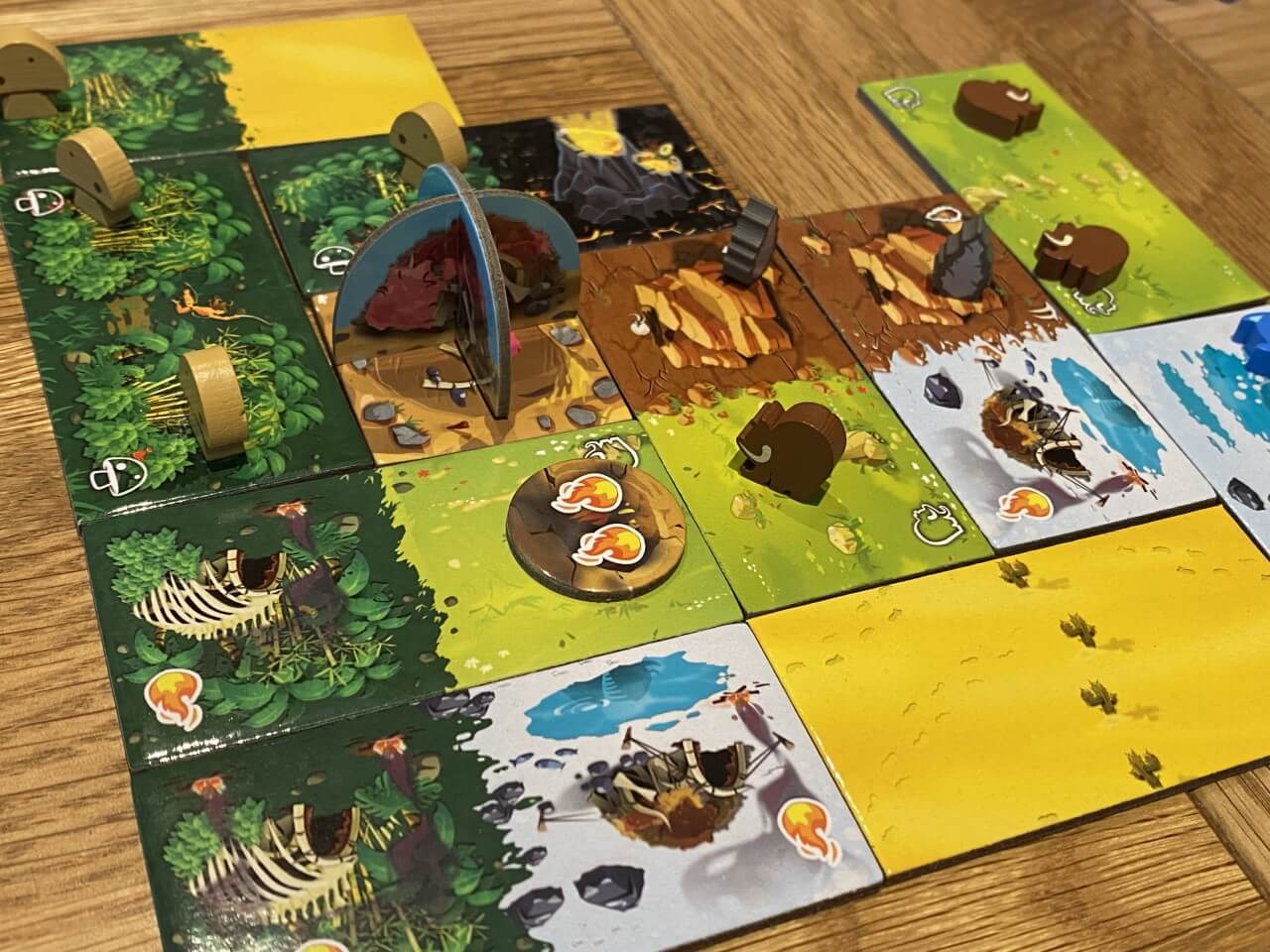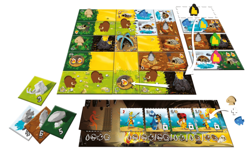 You earn points by collecting resources, with additional points when you have the majority of a type of resources. These resources allow you to bring cavemen to your territory, and each type of caveman has its own way to give you points based on their position.
