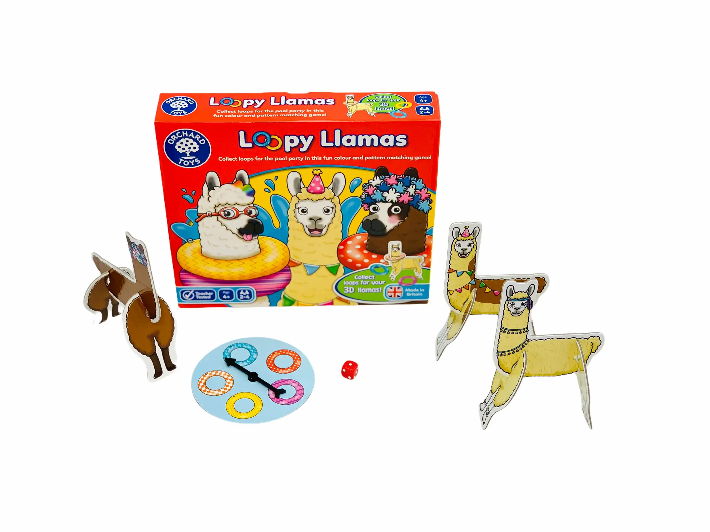 Players take turns moving around the swimming pool playing board collecting one of each of the coloured rings to stack on their 3D llama. Then race to be the first to get your llama to dive into the swimming pool to win the fame! Children will be laughing until the llamas come home in this fun pattern and colour recognition game.