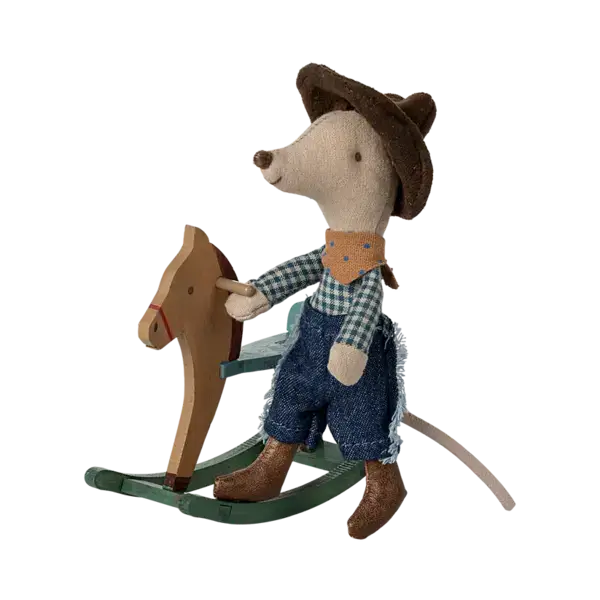 A fantastic set for hours of play. A cowboy mouse dressed in jeans, scarf and cowboy hat riding on his rocking horse. So cute!