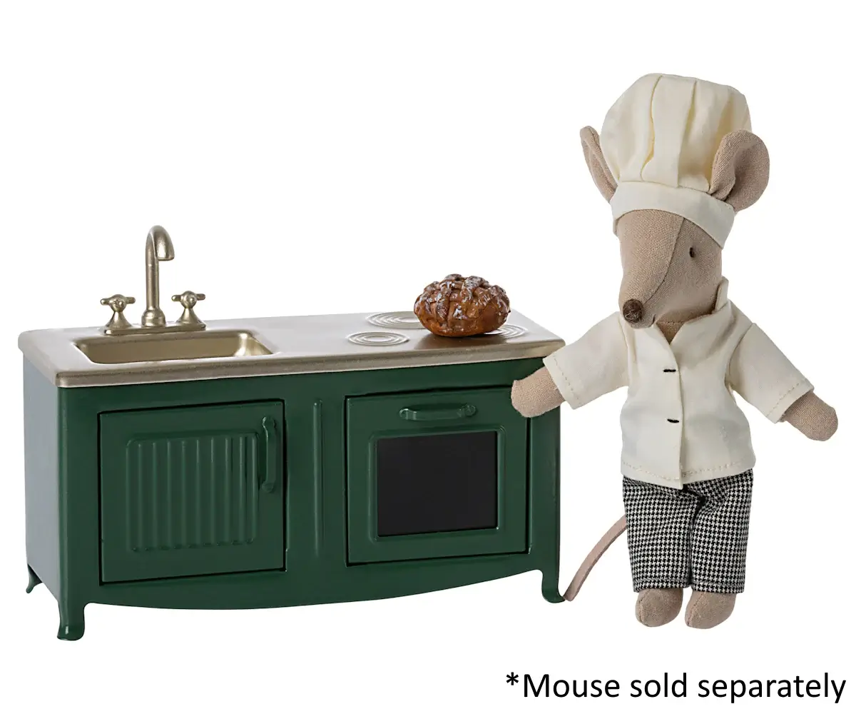 The kitchen is the heart of every home. This metal miniature kitchen with cupboards, oven and a sink is the perfect spot for your Chef Mouse to whip up a feast.