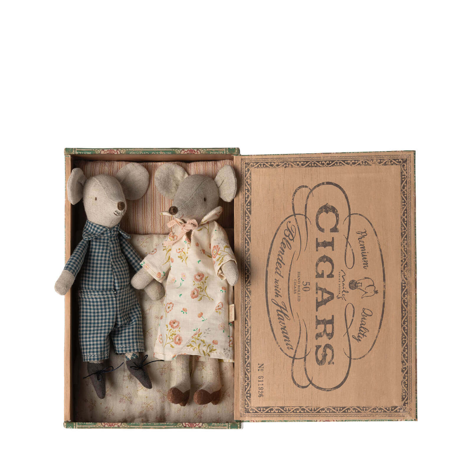 Grandma and Grandpa mouse are snug in their pyjamas, eye masks and shoes. Their grand old match box is furnished with a cushion, pillow and blanket.