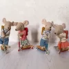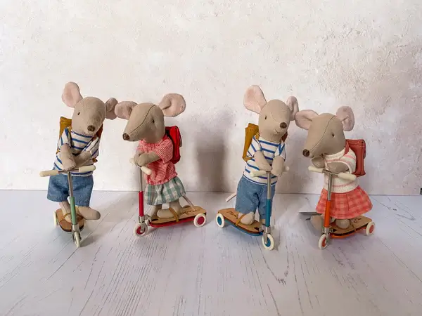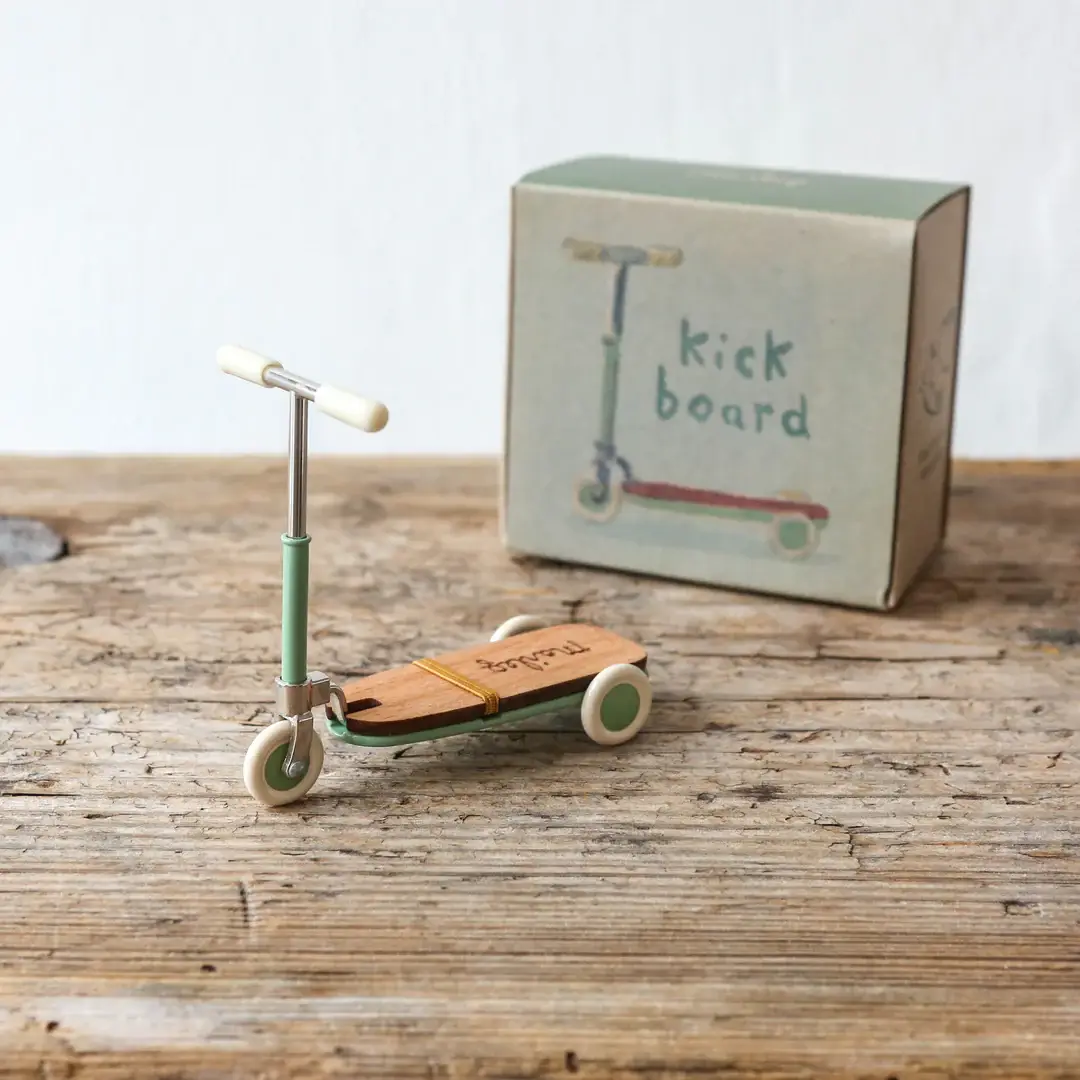 A kickboard for your Maileg friends to scoot around and have some fun! Mice with magnets in their hands are able to hold onto the handlebars.  A small elastic is added on the board to keep your mice friends feet secure during the ride.