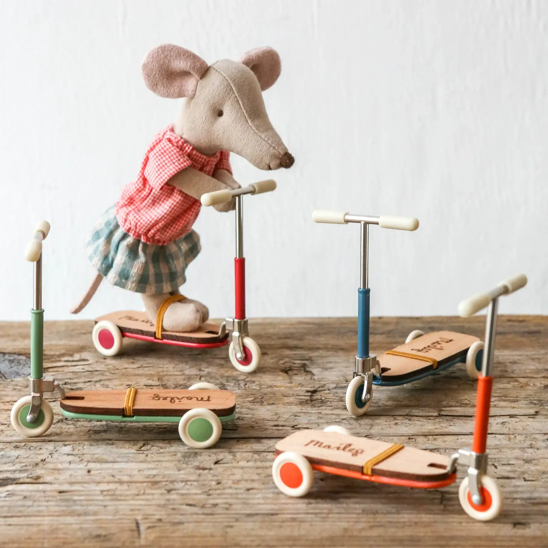 A kickboard for your Maileg friends to scoot around and have some fun! Mice with magnets in their hands are able to hold onto the handlebars.  A small elastic is added on the board to keep your mice friends feet secure during the ride.
