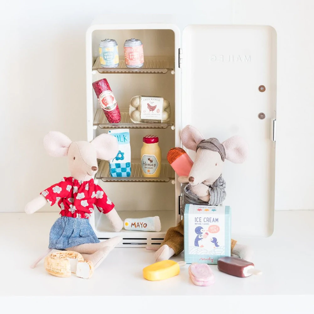 An old fashioned fridge that fits perfectly into the House of Miniature dollhouse. The fridge is made of metal with a magnetic lock and frosted shelves inside. A great addition to this fridge is our Miniature grocery box.