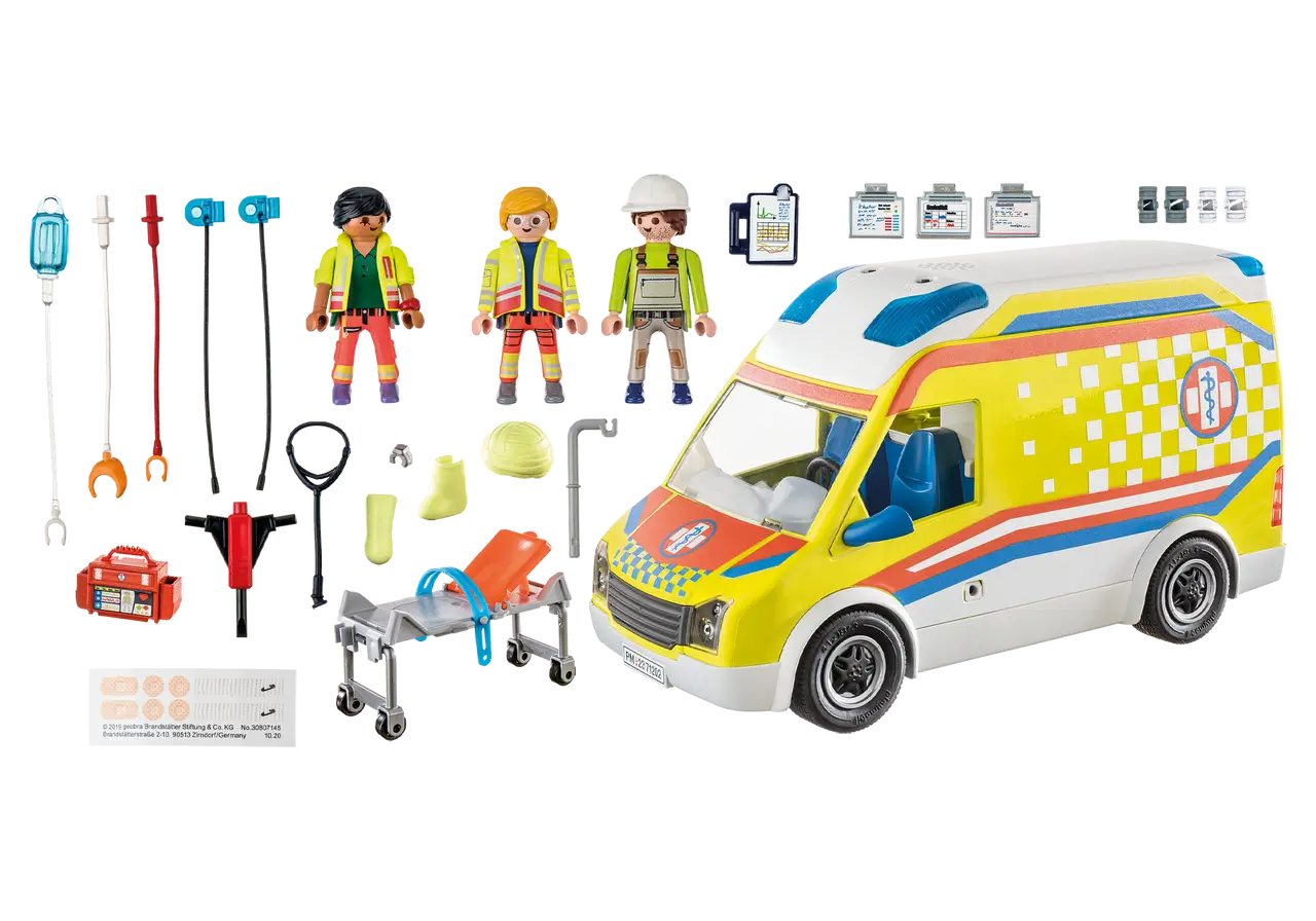 The set features a detailed ambulance equipped with flashing lights and realistic sound effects, transporting young adventurers to the heart of the action. Inside the ambulance, a medical team of two figures, a doctor and a paramedic, are ready to respond to emergencies. The set also includes a stretcher, medical equipment and a traffic cone to create authentic rescue scenarios. With its high-quality construction and attention to detail, this Playmobil playset provides endless hours of fun and learning for children of all ages.