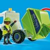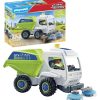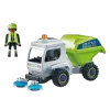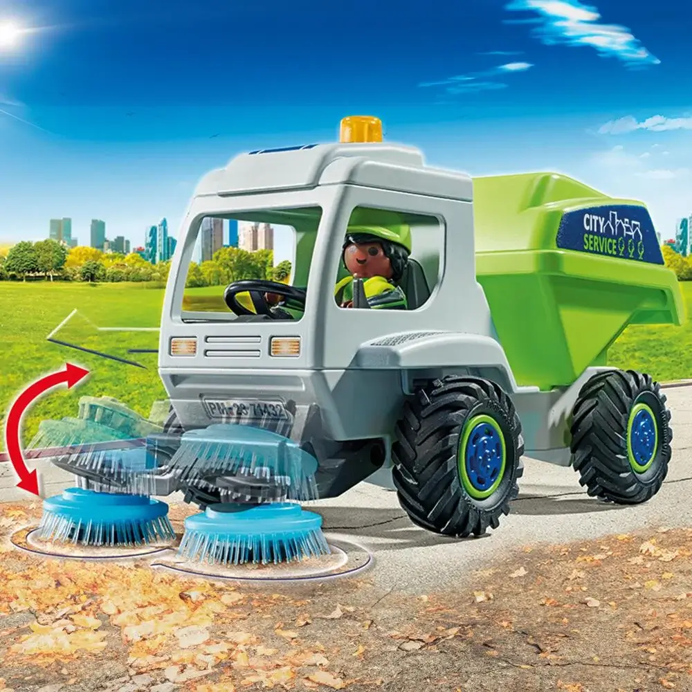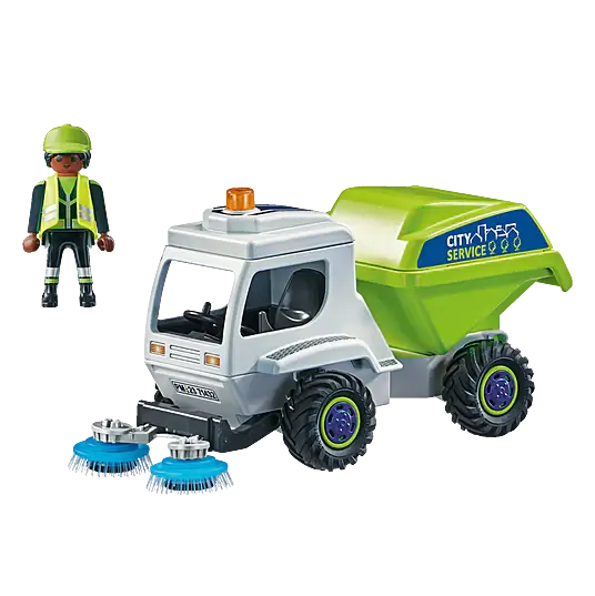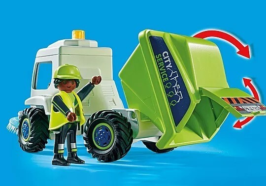 The set includes a sweeper with rotating brushes and a Playmobil figure with a cap. If the sweeping brushes of the machine touch the ground, they rotate automatically. For emptying, the tailgate can be opened and the skip can be tilted. For easier insertion of the figure, the roof of the sweeper is removable.