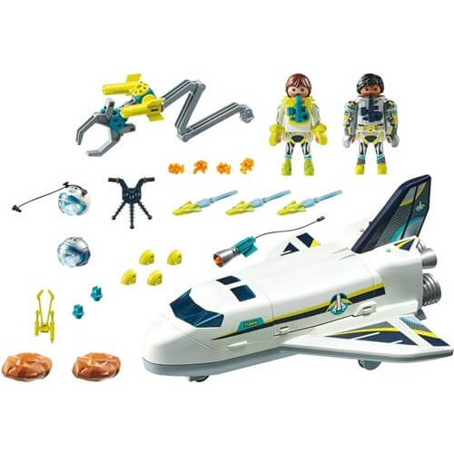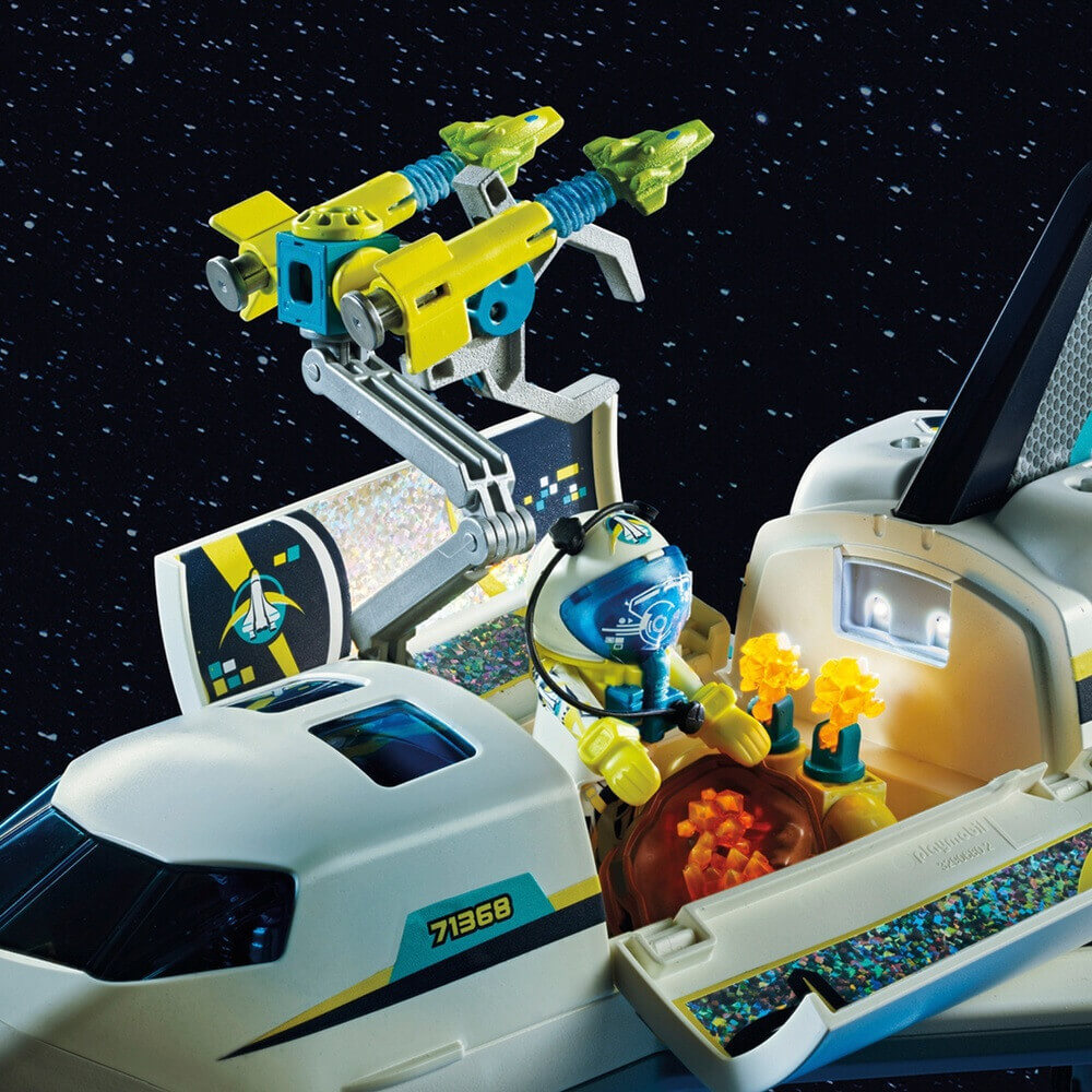 Get ready for the PLAYMOBIL Space Shuttle Mission with two astronauts in research gear, light effects for rocket engine and interior lighting. Firing cannons fend off threats.