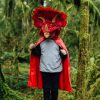 This dinosaur cape features textured velour fabric, realistic eyes, and 3D stuffed detailing on the hood. The design includes horns and felt detailing around the head, a lined hood and Velcro closure making this cape durable and ready for many wears.