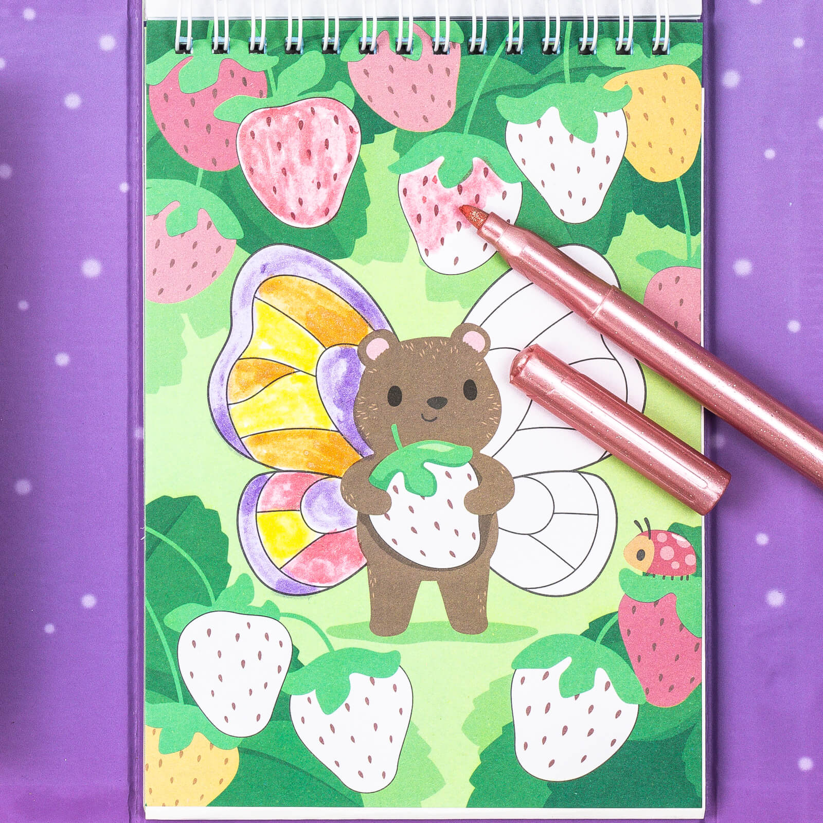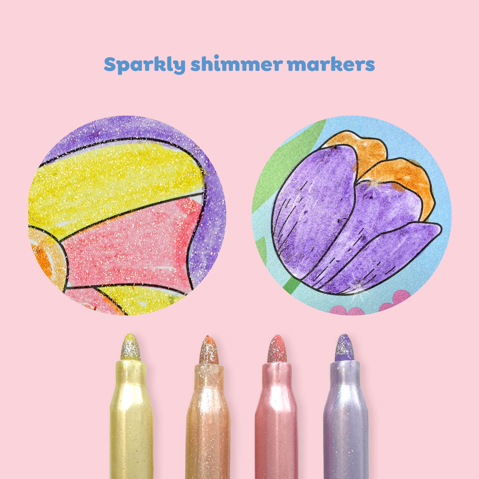 Includes 36 high contrast, illustrated colouring pages and 4 liquid shimmer markers