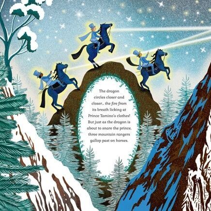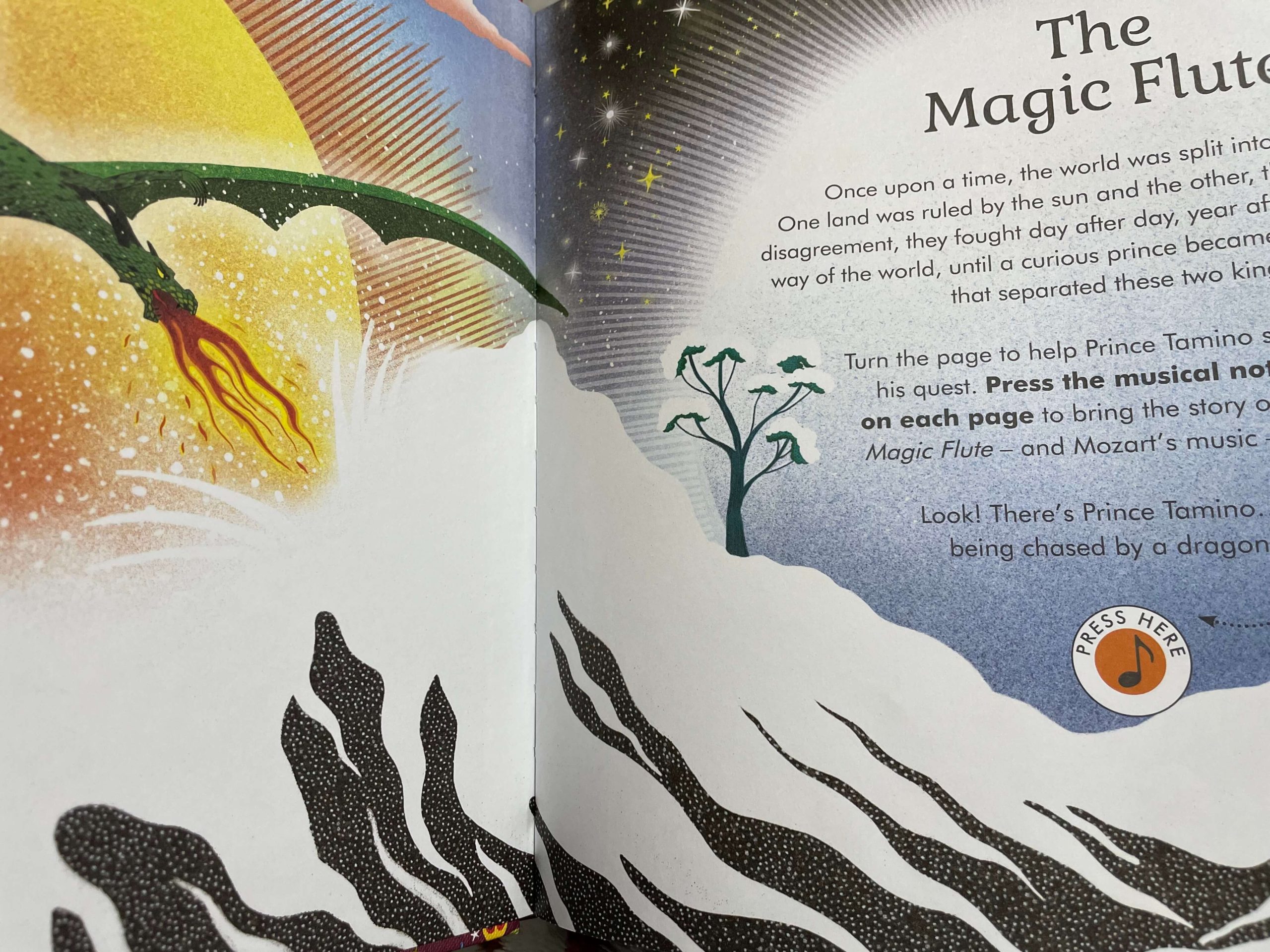 Discover the sorcery of The Magic Flute in this musical retelling of the opera – push the button on each beautiful scene to hear the vivid sound of an orchestra playing, and singers singing, from Mozart’s score. This tale of a prince, a princess and a magic flute begins in a mountain ridge between two magical lands. Prince Tamino enters, chased by a dragon, but three brave mountain rangers gallop past on horseback to rescue him. His cowardly friend Papageno comes out from his hiding place and they revive the prince. The rangers ask for one favour in return. Their boss, the Queen of the Night, asks Prince Tamino to rescue her daughter, Princess Pamina, from the evil Sun King. She gives Tamino a magic flute and Papageno some magic bells to help them. The story follows Prince Tamino as he breaks into the Sun King’s palace, charms the court with his magic flute, and gets caught by the guards. Will the prince escape with the princess?