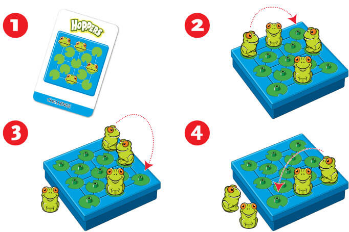 Hoppers is a great frog jumping game! Created by Nob Yoshigahara, Hoppers is based on the classic peg solitaire game “The Great Thirteen”. To play, set up the board according to one of the challenge cards, then use your thinking skills to find the right sequence to remove all the frogs except the red one.