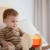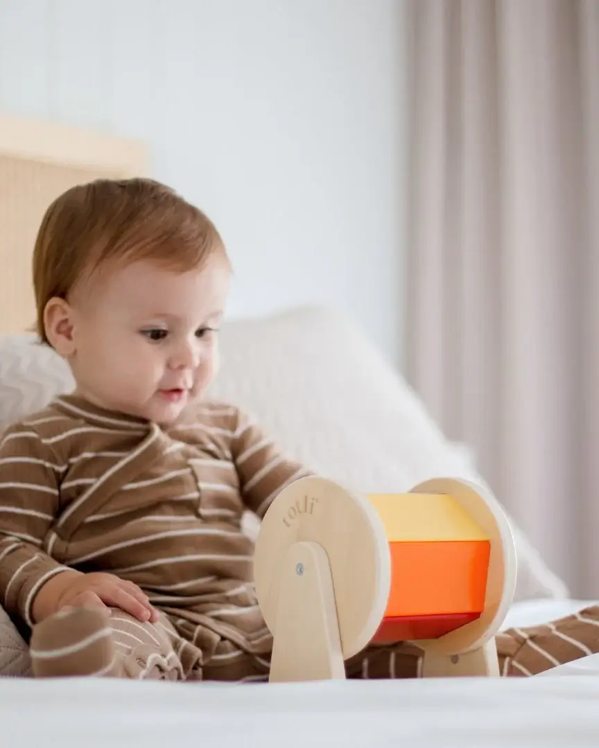 Perfect for practicing fine motor skills, coordination, and learning to reach with both hands at once. The Totli Rainbow Spinning Drum turns 360 degrees as it makes a gentle musical sound. Your little one will love gripping, spinning, and learning about cause and effect. A tummy-time favourite!