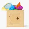 The Totli Box is made from birchwood and food-grade silicone. The play silks are 100% chiffon material. The wooden ball and coins are crafted from beechwood and coated with non-toxic, water-based paints and finishes.